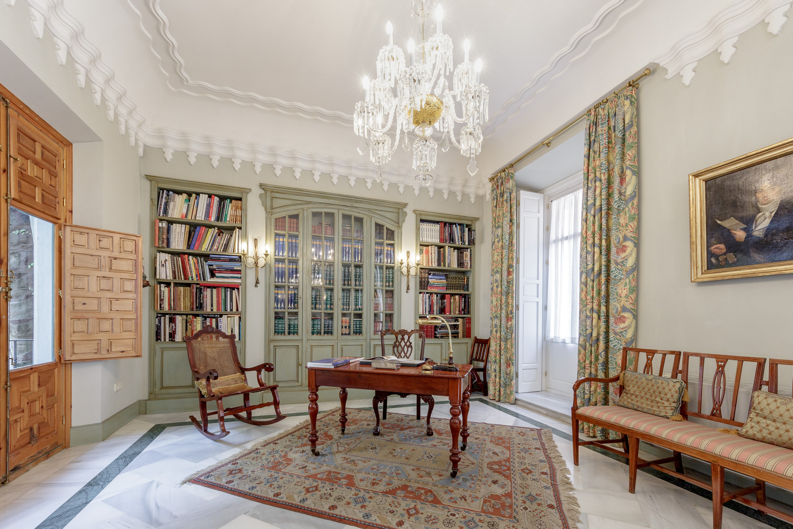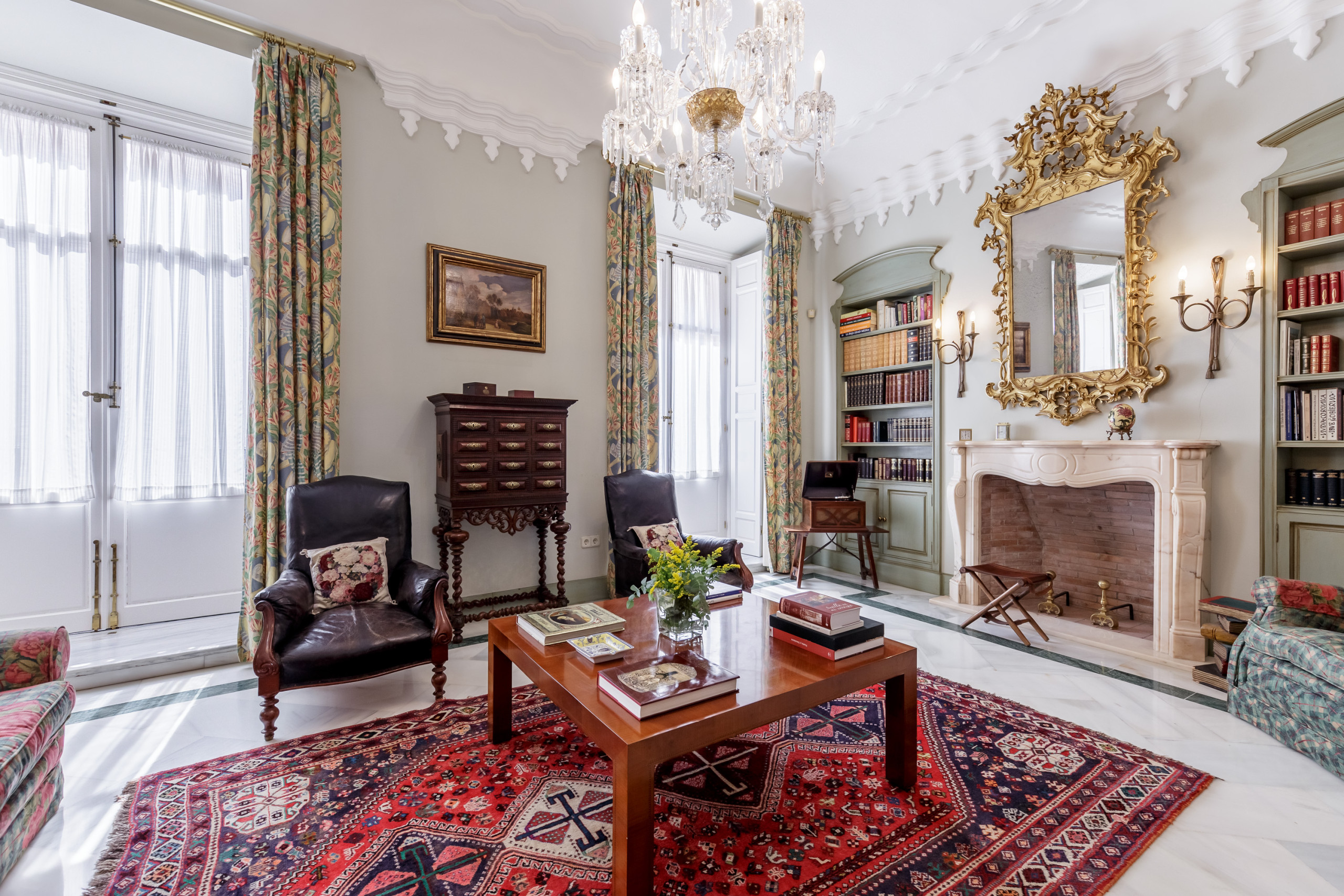 • Gran salón-biblioteca, la joya del apartamento, con tres balcones a la calle y luz natural durante todo el día: el mejor palco imaginable para ver la Semana Santa