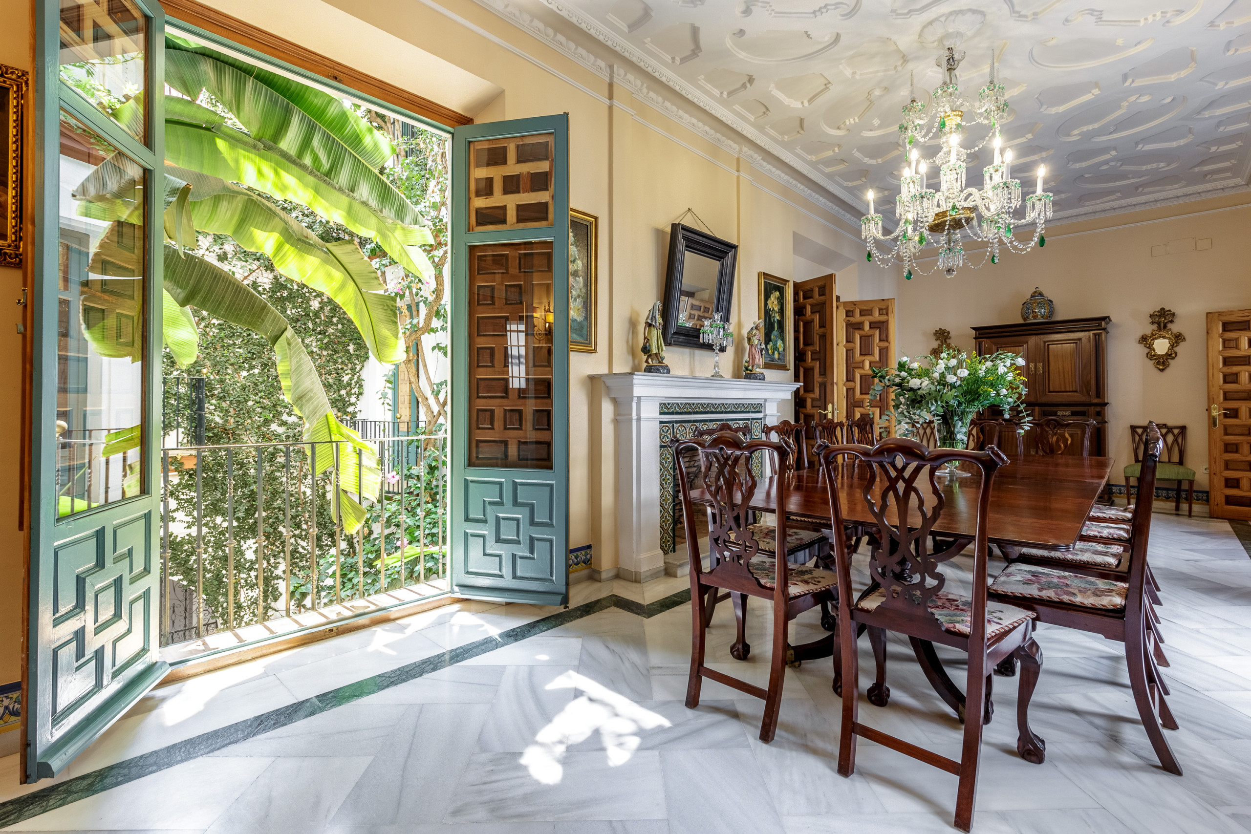 Distribuido alrededor del patio principal, este luminoso apartamento combina proporciones generosas, techos altos y materiales nobles —mármol, madera, cerámica artesanal— con una cuidada decoración de estilo español contemporáneo.