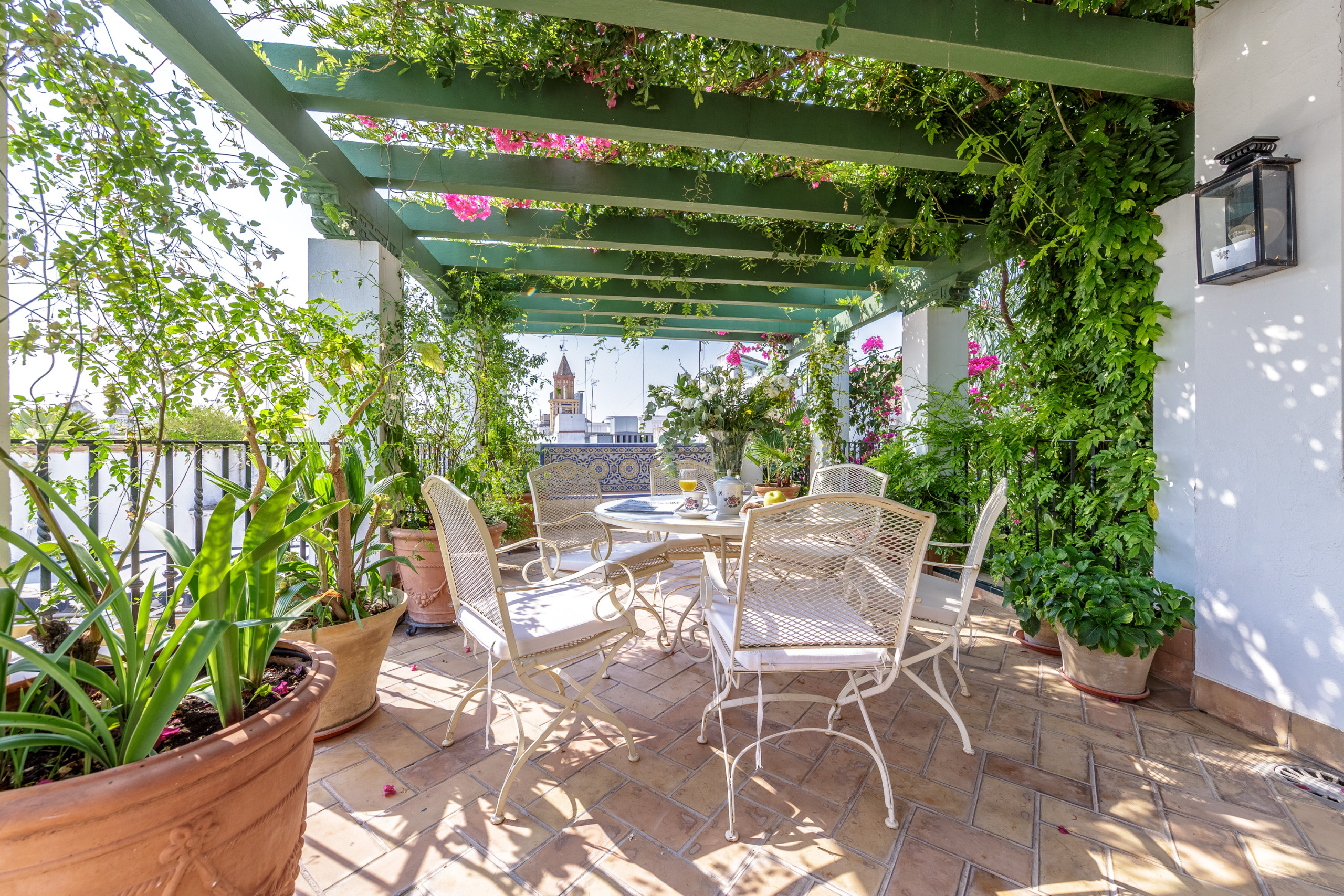 un jardín elevado repleto de vegetación, solárium con ducha pluvial y rincones para desayunar o disfrutar del atardecer con vistas a las cúpulas, espadañas y terrazas del Barrio de la Judería. En esta planta se encuentra también la lavandería común (lavadora, secadora y tendederos individuales).