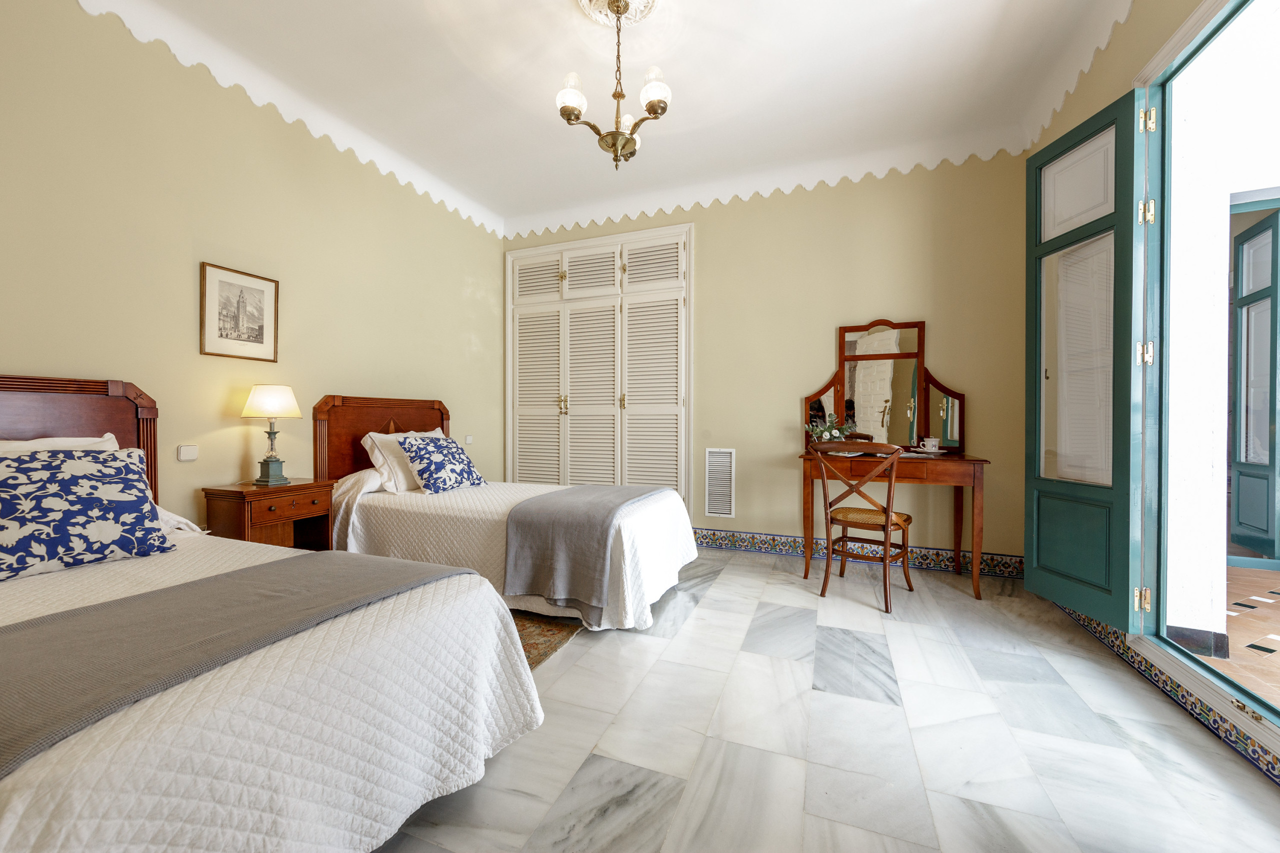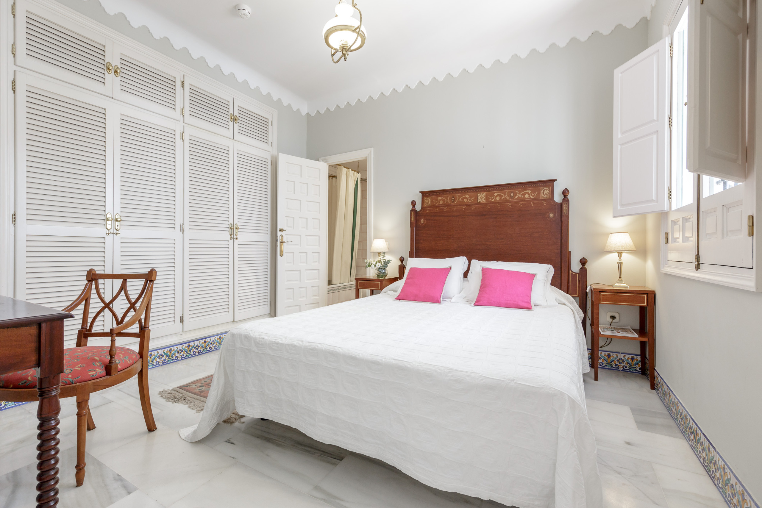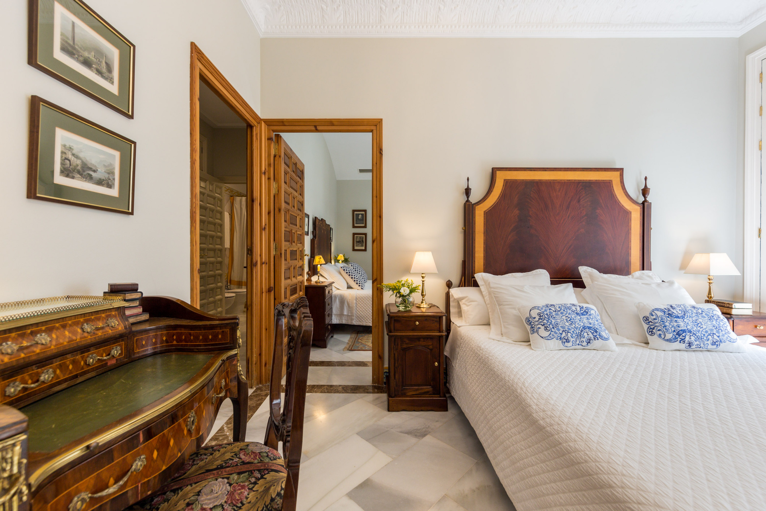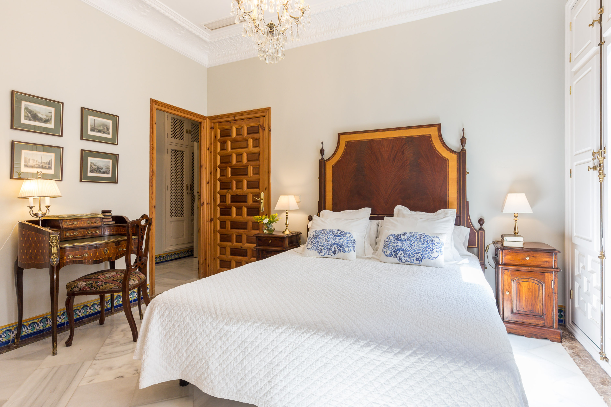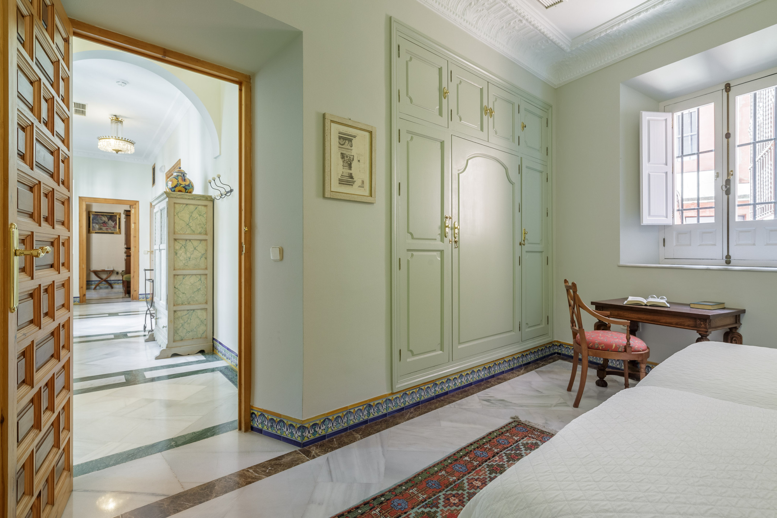Distribuido alrededor del patio principal, este luminoso apartamento combina proporciones generosas, techos altos y materiales nobles —mármol, madera, cerámica artesanal— con una cuidada decoración de estilo español contemporáneo.