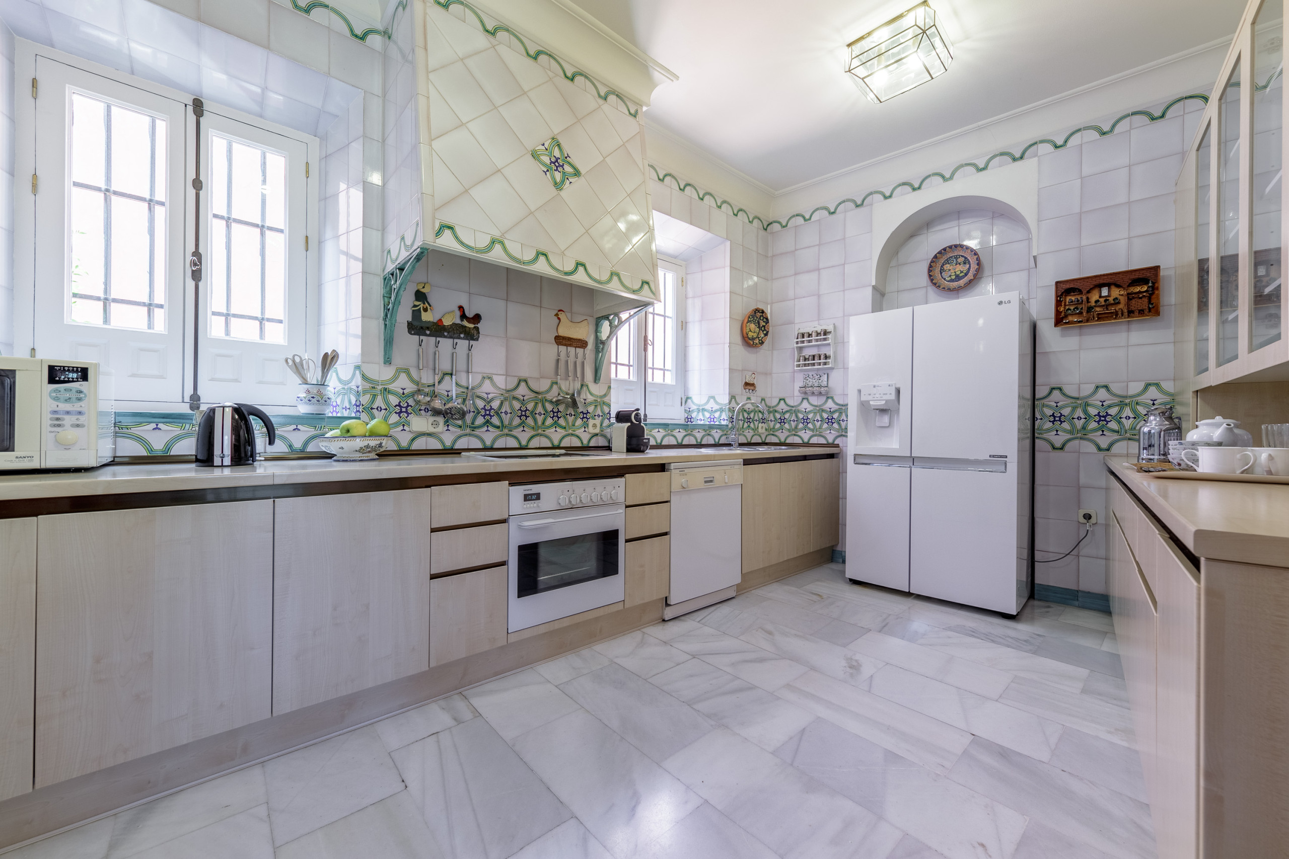 Distributed around the main courtyard, this bright apartment combines generous proportions, high ceilings and noble materials —marble, wood, artisan ceramics— with a carefully curated contemporary Spanish style decoration.