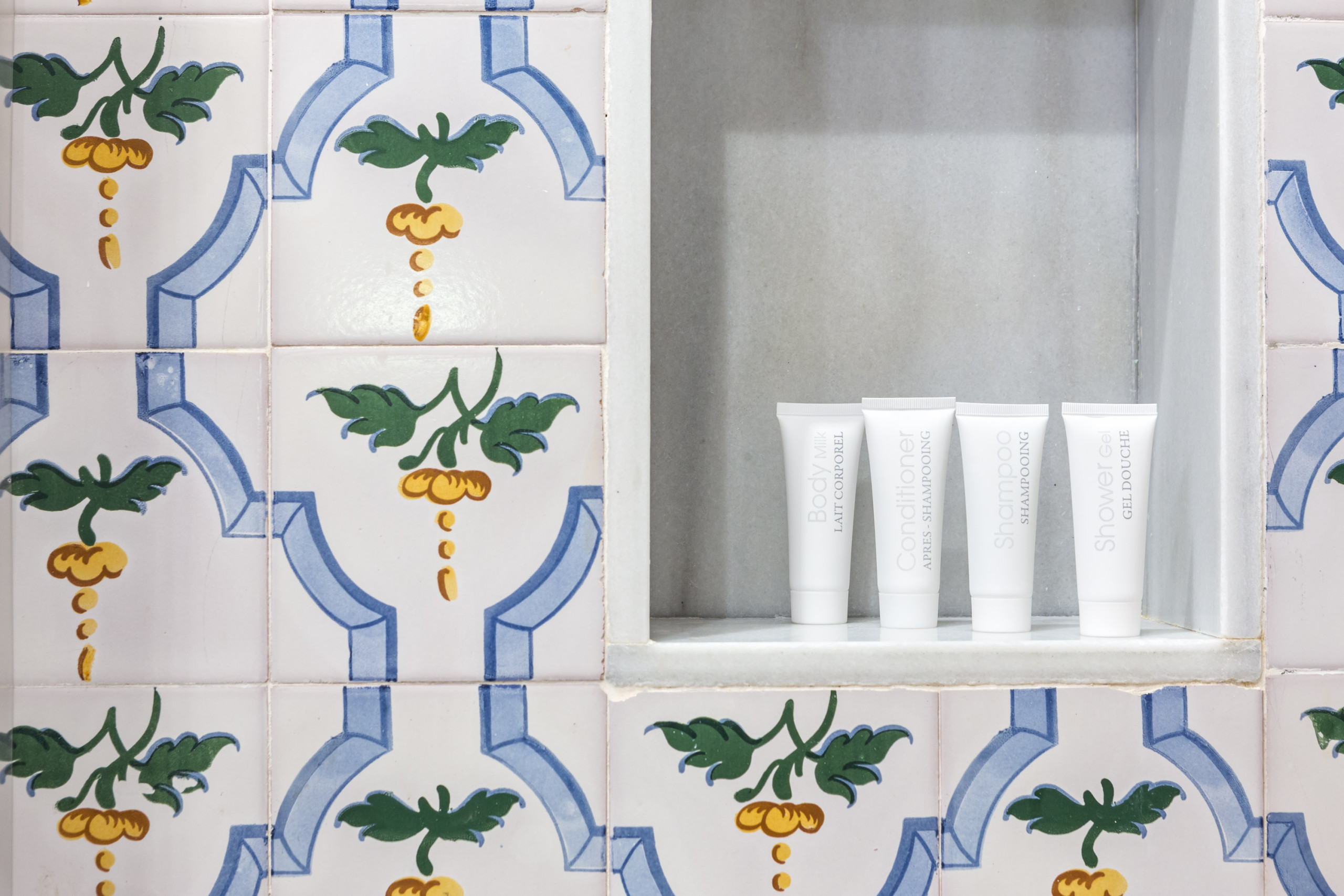 The second bedroom stands out for a delicate artistic ceramic mural that acts as a headboard. It features a double bed, a large-capacity antique wardrobe, bedside tables, an upholstered armchair and its own en-suite bathroom, ensuring privacy and comfort for each guest.